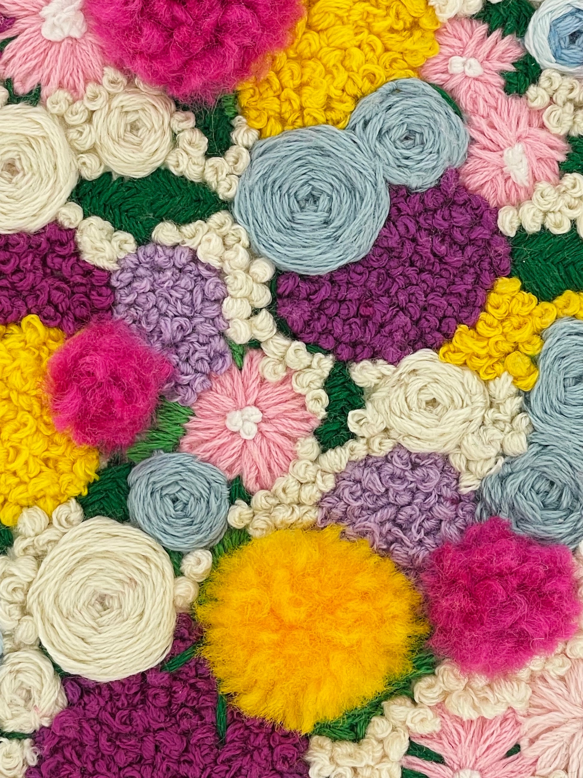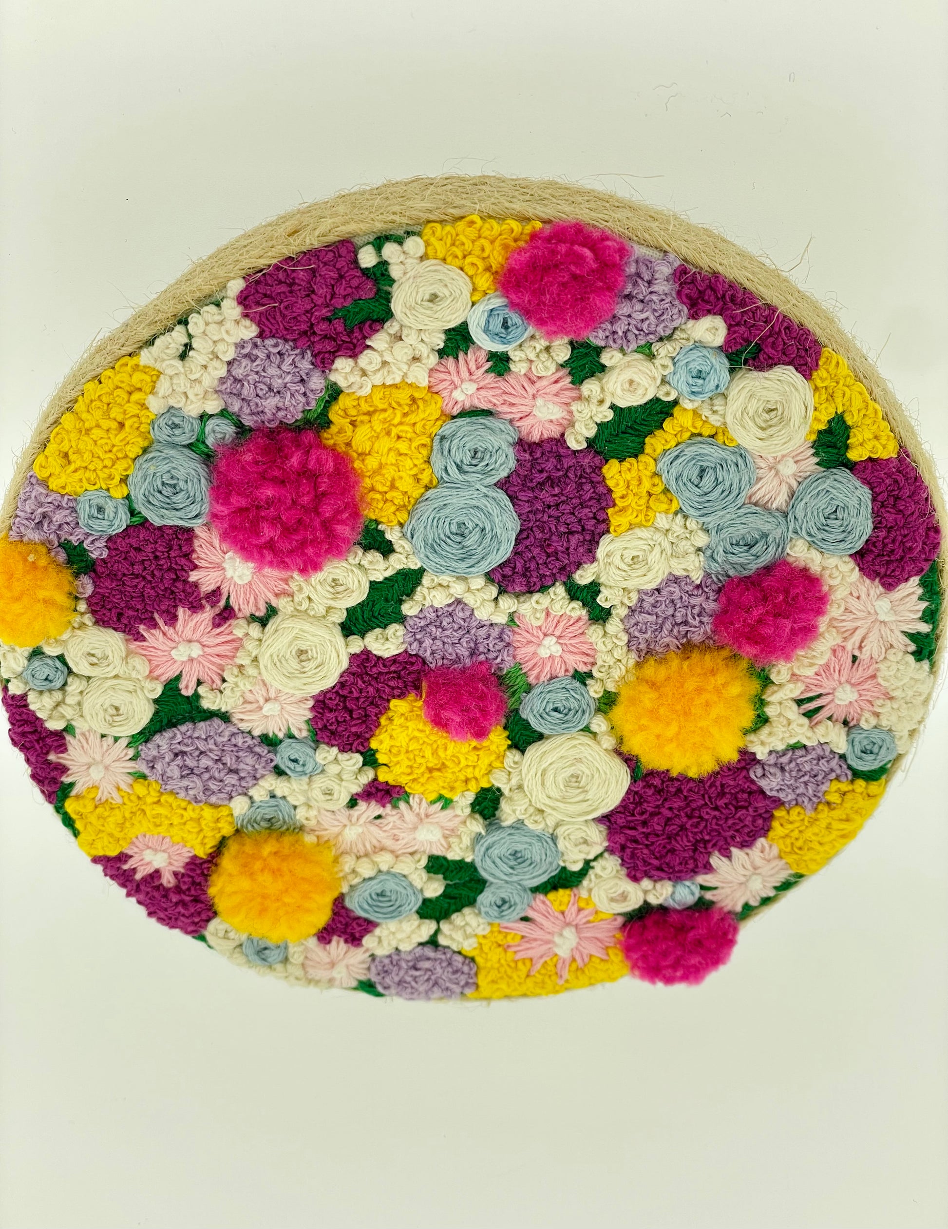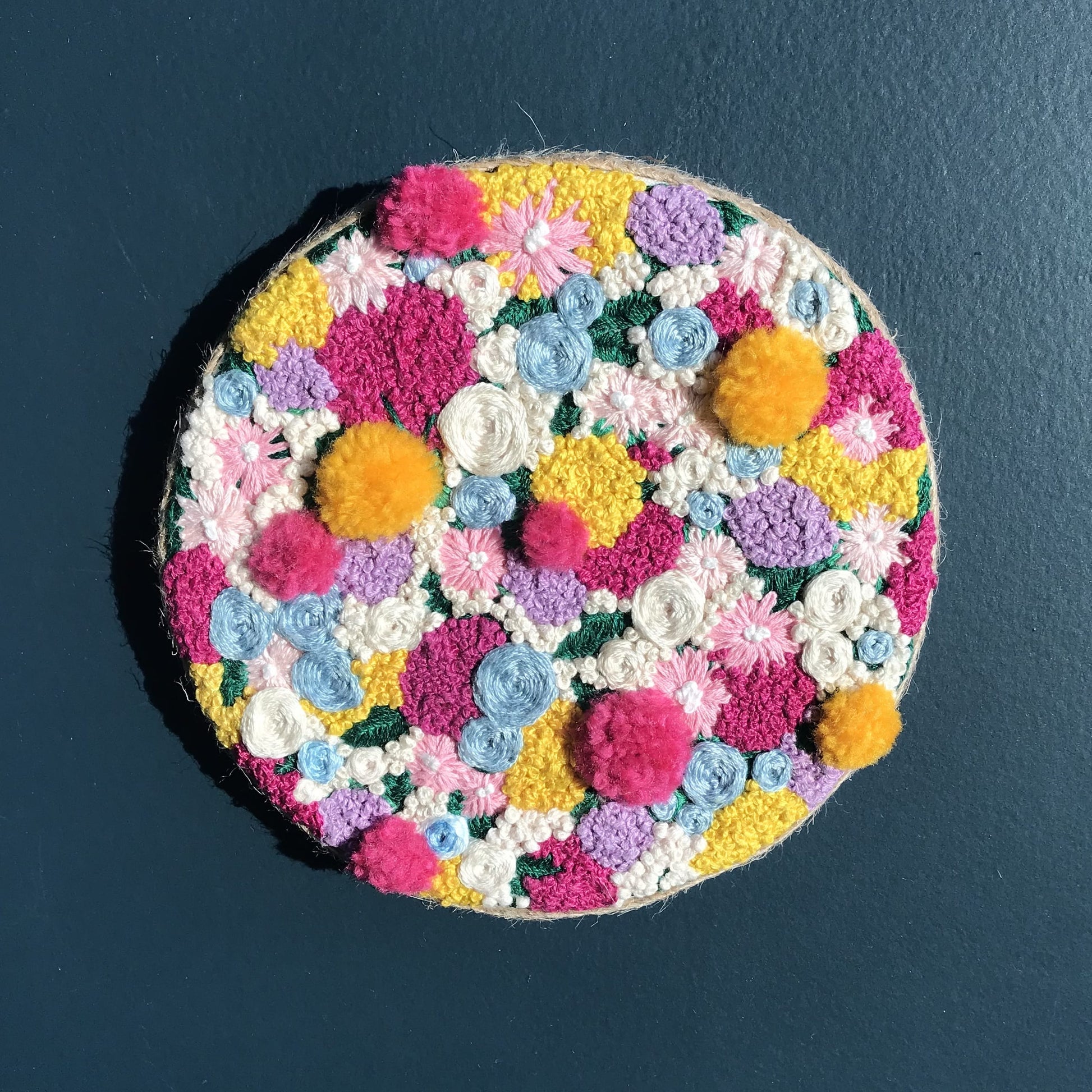 Hand embroidered flowers by Etta with DMC threads and woollen pom poms.
