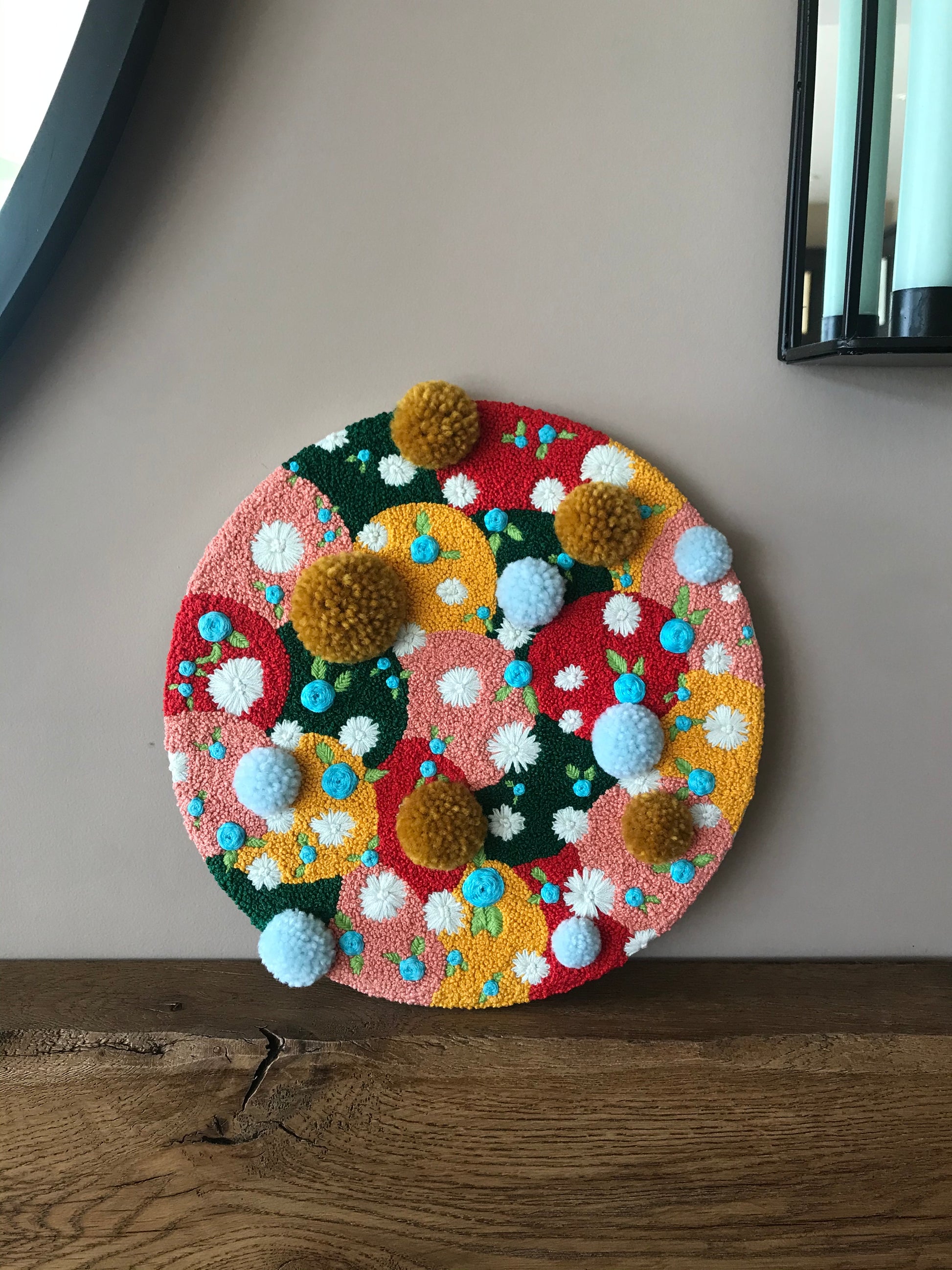 Hand embroidered flowers by Etta with DMC threads and woollen pom poms.