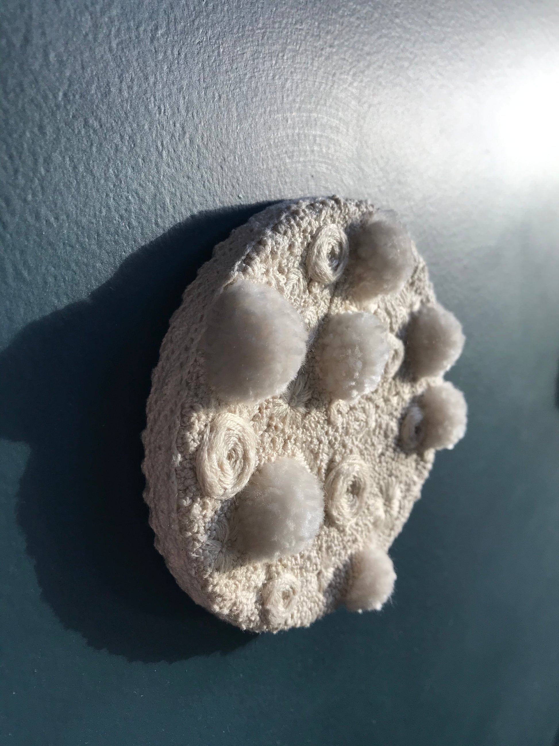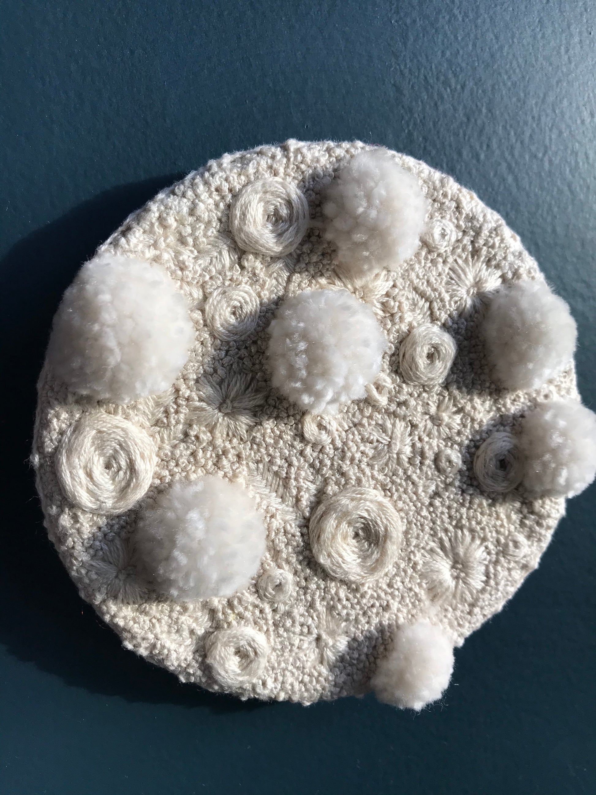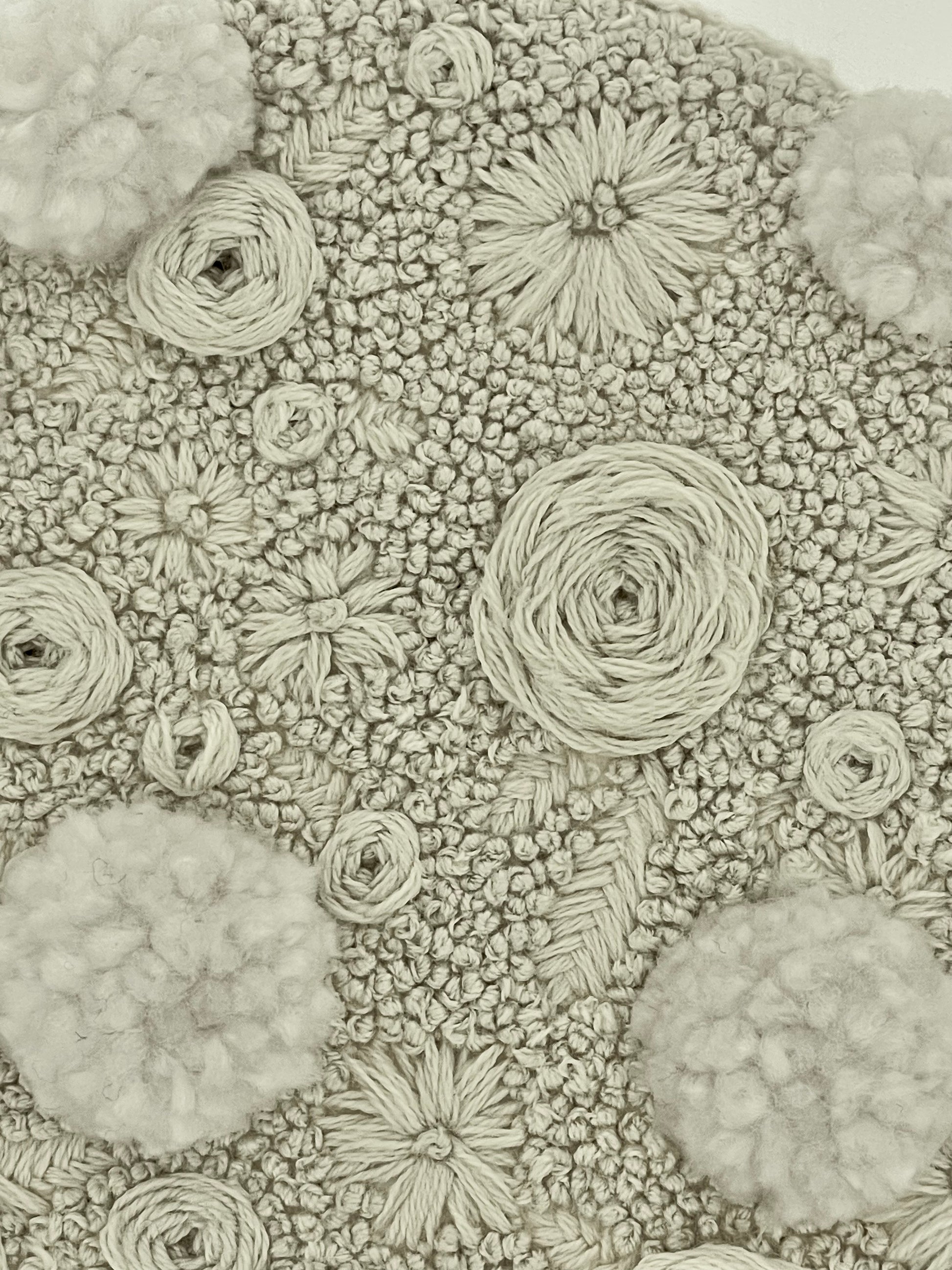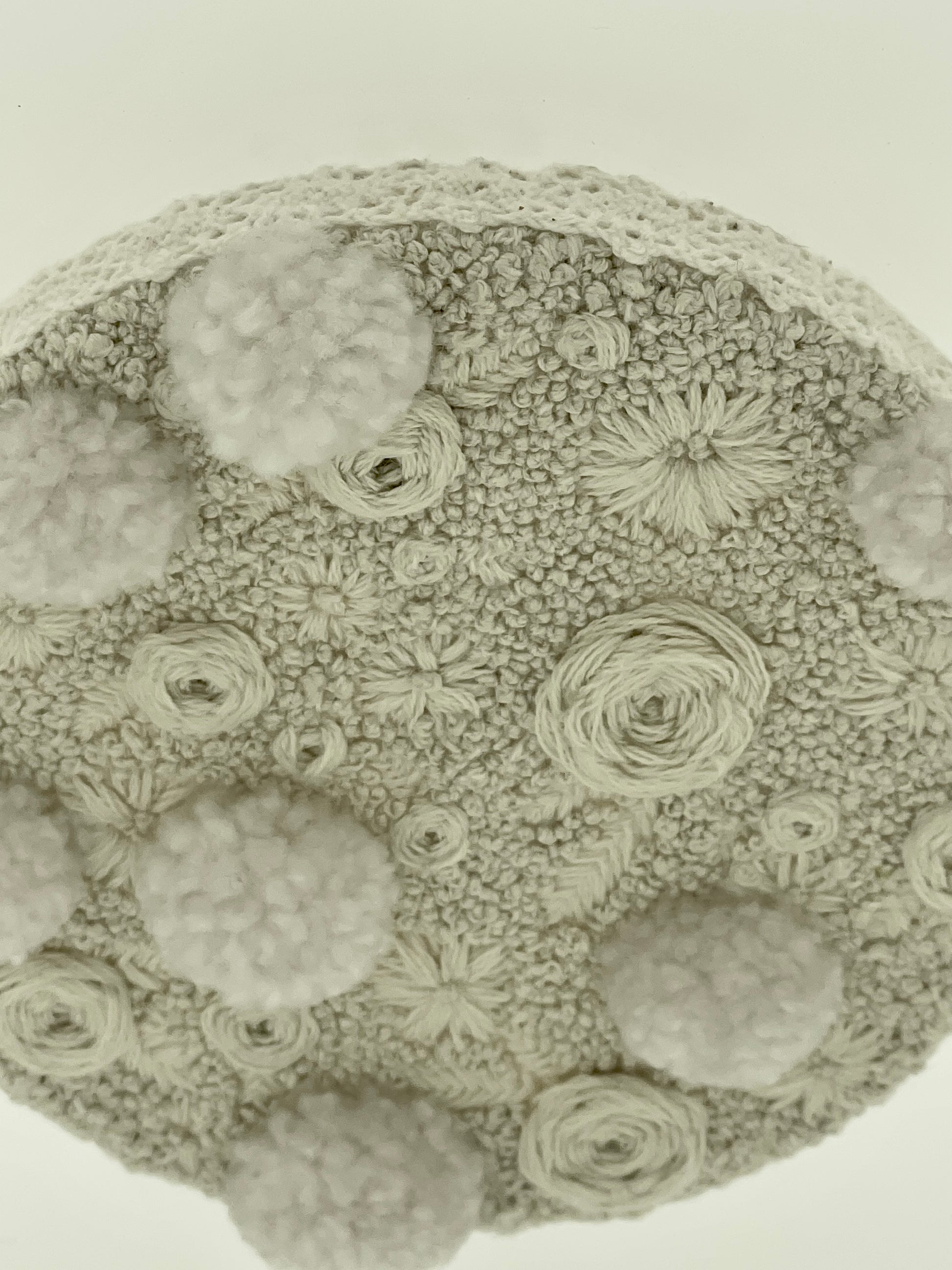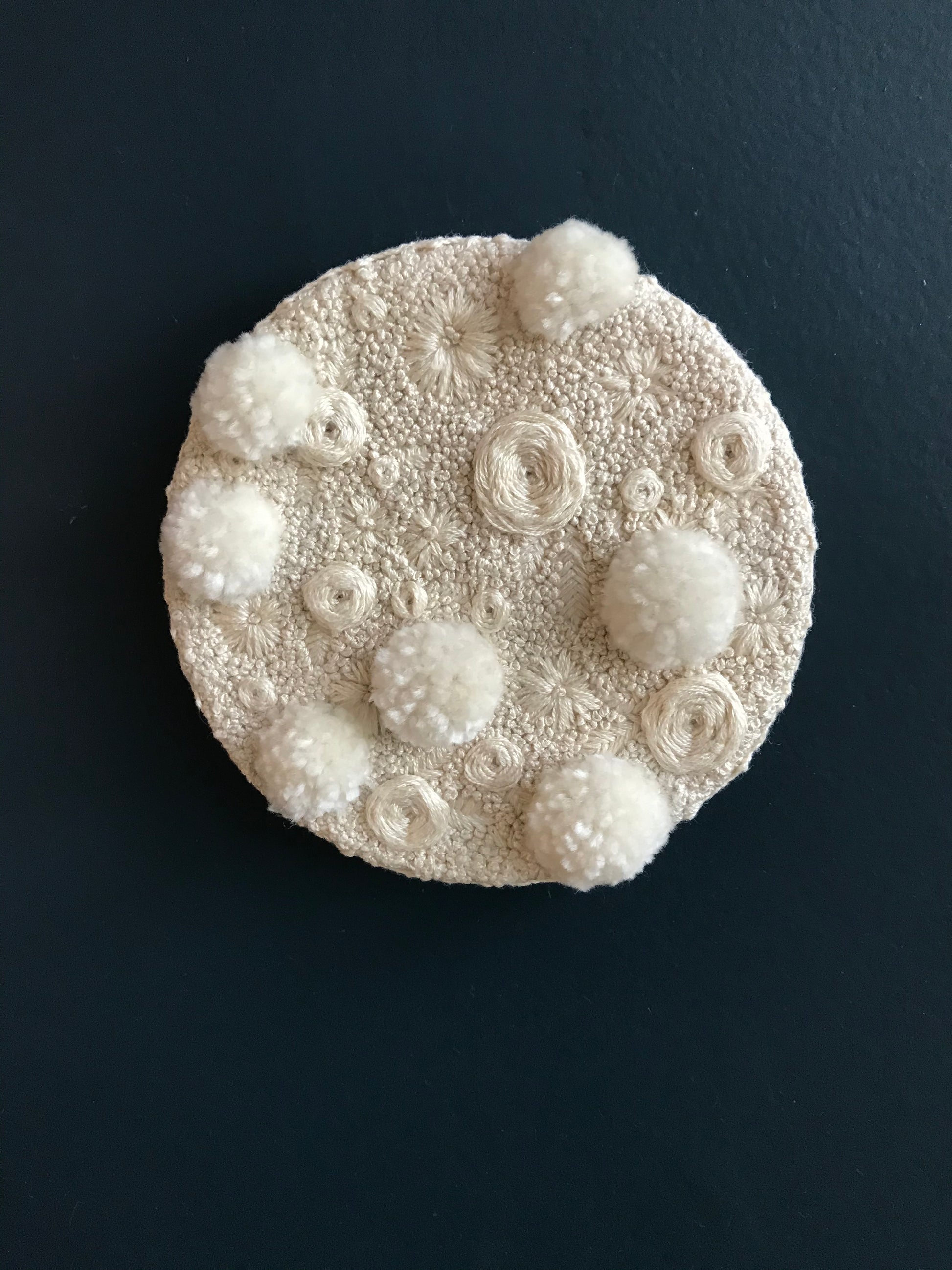 Hand embroidered flowers by Etta with DMC threads and woollen pom poms.